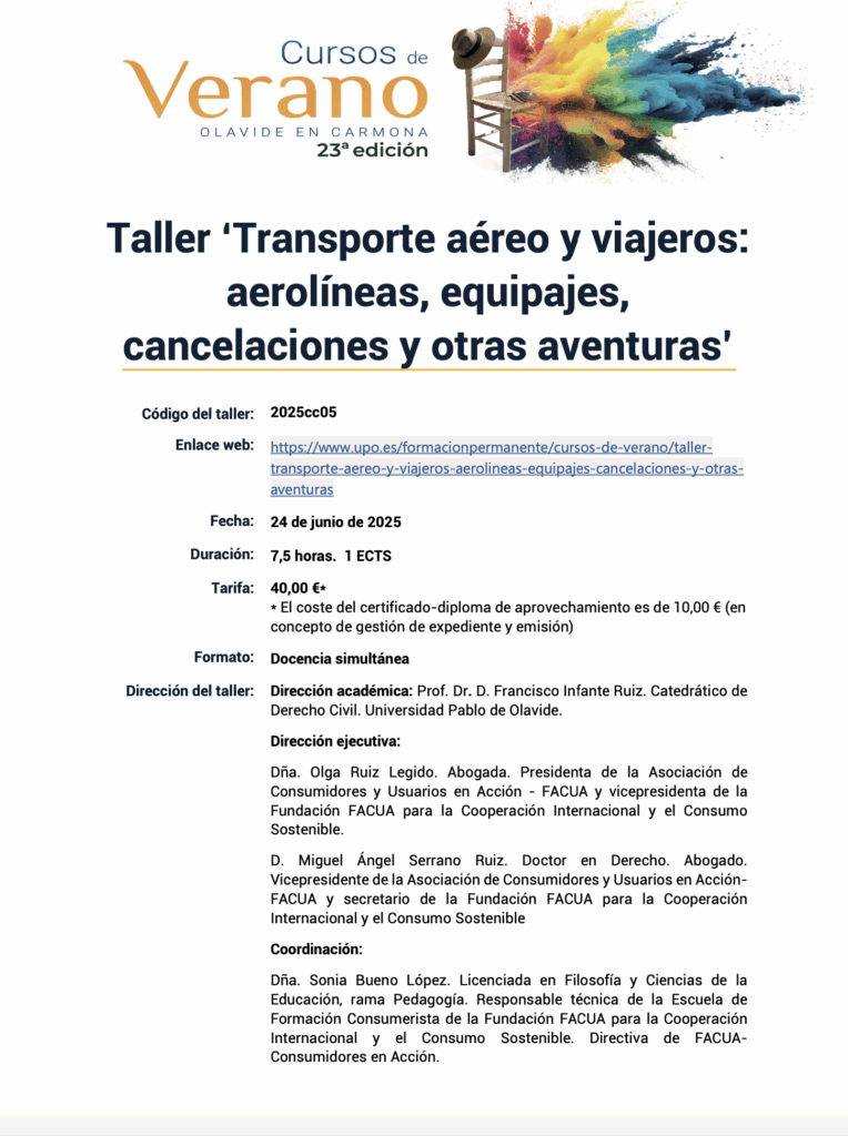 Taller ‘Transporte aéreo y viajeros: aerolíneas, equipajes, cancelaciones y otras aventuras’, celebrado el 24 de junio de 2025, bajo la dirección académica del IP1 Francisco Infante Ruiz. En este taller se trabajó sobre los desafíos que presenta el uso del transporte aéreo para los viajeros, así como las opciones de reclamación disponibles bajo la normativa vigente. Presentación de ponencia por el IP1 del grupo sobre contratación digital.